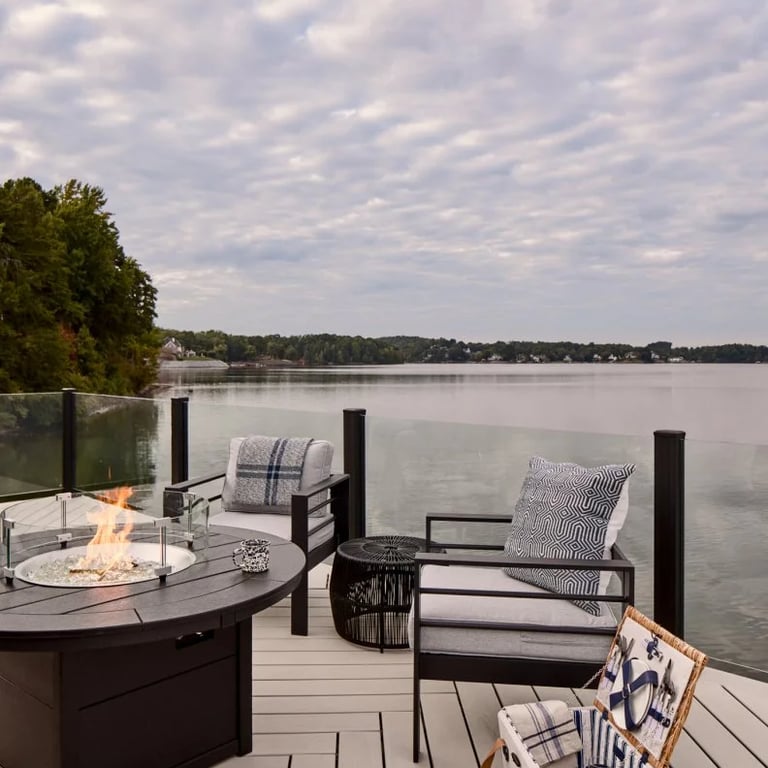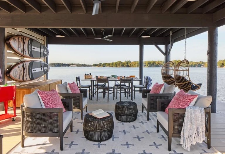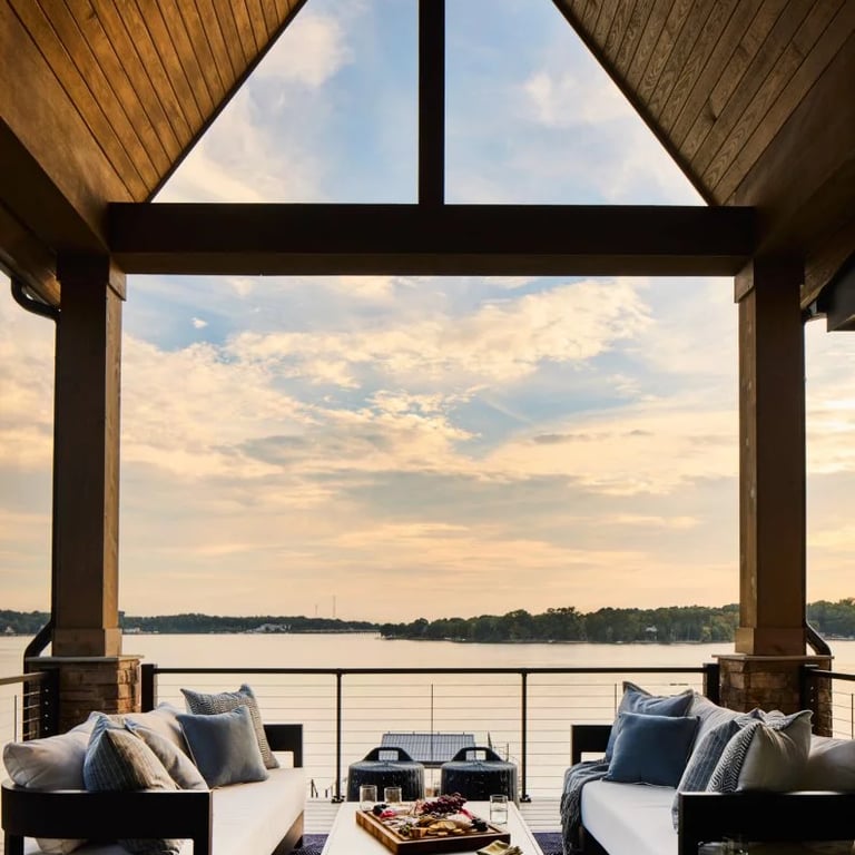 From lake-facing seating areas to the two-story dock, outdoor spaces are treated with the same care as the interior. Comfortable furniture, layered lighting, and natural materials make these areas feel like additional rooms, not afterthoughts.