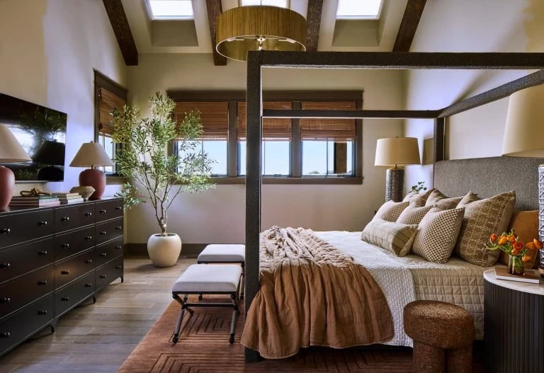 The primary bedroom leans into soft, cozy minimalist home styling.