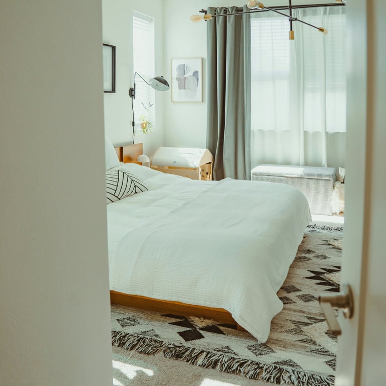 Identify the surfaces and areas that feel hardest visually: bare floor, uncovered windows, flat walls, minimal bedding. Address them in order of what you see most from the bed. A rug if there is bare floor. Curtains that reach the floor if the windows are bare. A throw at the foot of the bed if the bedding feels flat. These additions do not need to be expensive. They need to be soft, warm-toned, and present.