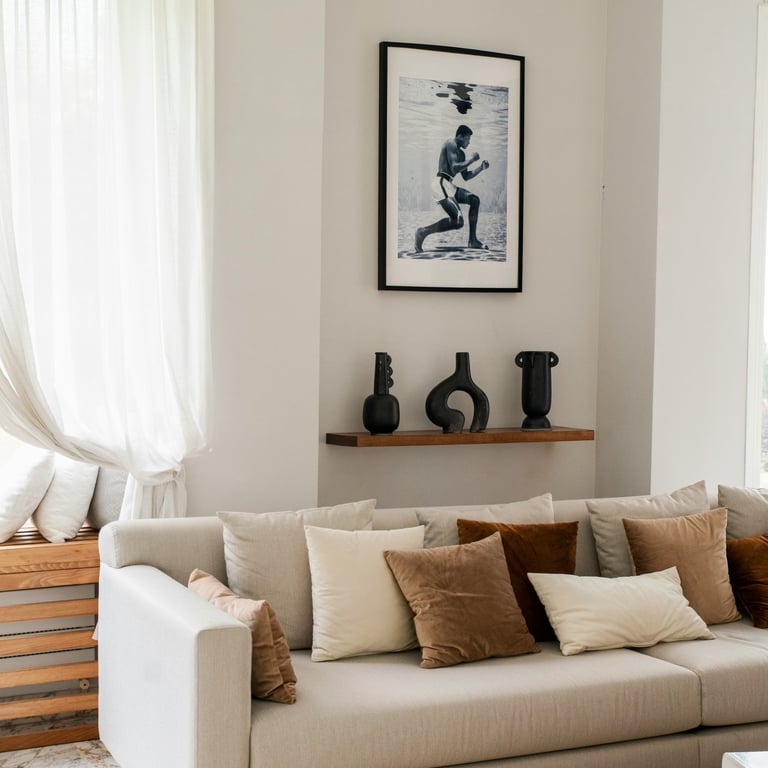 These are not expensive problems to fix, but they do require replacing or repositioning rather than adding. A correctly sized rug, where at least the front legs of all main furniture pieces sit on it, changes the feeling of an entire room. Art hung at the right height and sized appropriately for the wall can make a room feel finished almost instantly.