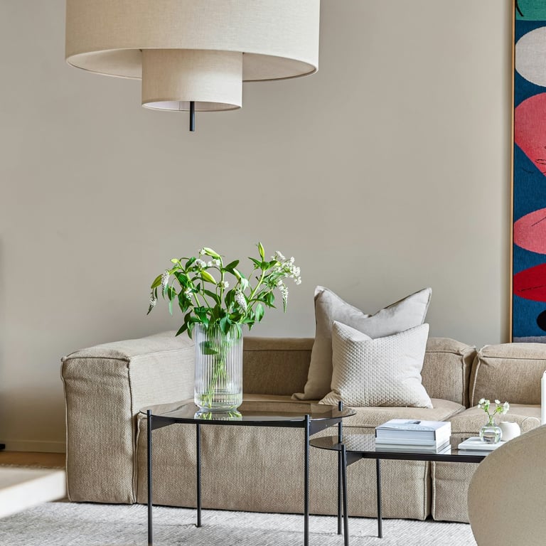 Choose one cold material in the room and introduce its warmer counterpart nearby. A glass coffee table gets a wooden tray on top of it. A chrome lamp gets replaced with a ceramic one. A smooth synthetic cushion gets swapped for a linen or wool one. You don't need to change everything. One material shift at a time moves the room toward warmth.